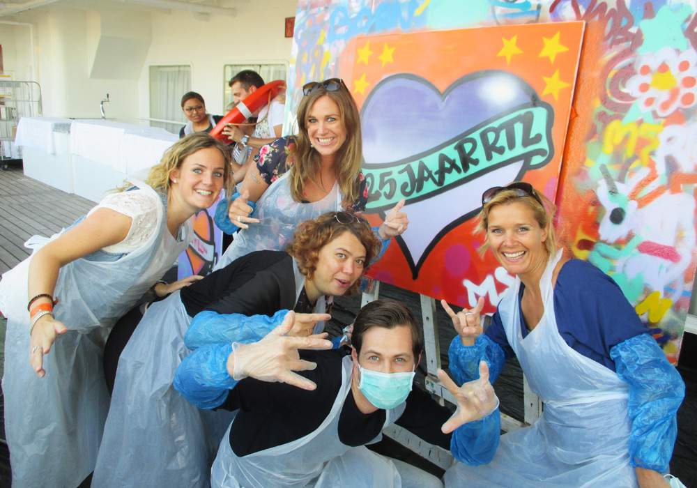 Wanneer u kiest voor onze workshops bent u ervan verzekerd dat alles tot in de puntjes wordt verzorgd. Vanzelfsprekend zorgen wij voor alle materialen, de beschermende kleding en een keurig afgedekte ruimte. Ook nemen wij grote canvas doeken mee waarop de deelnemers tijdens de workshop hun kunstwerk maken.